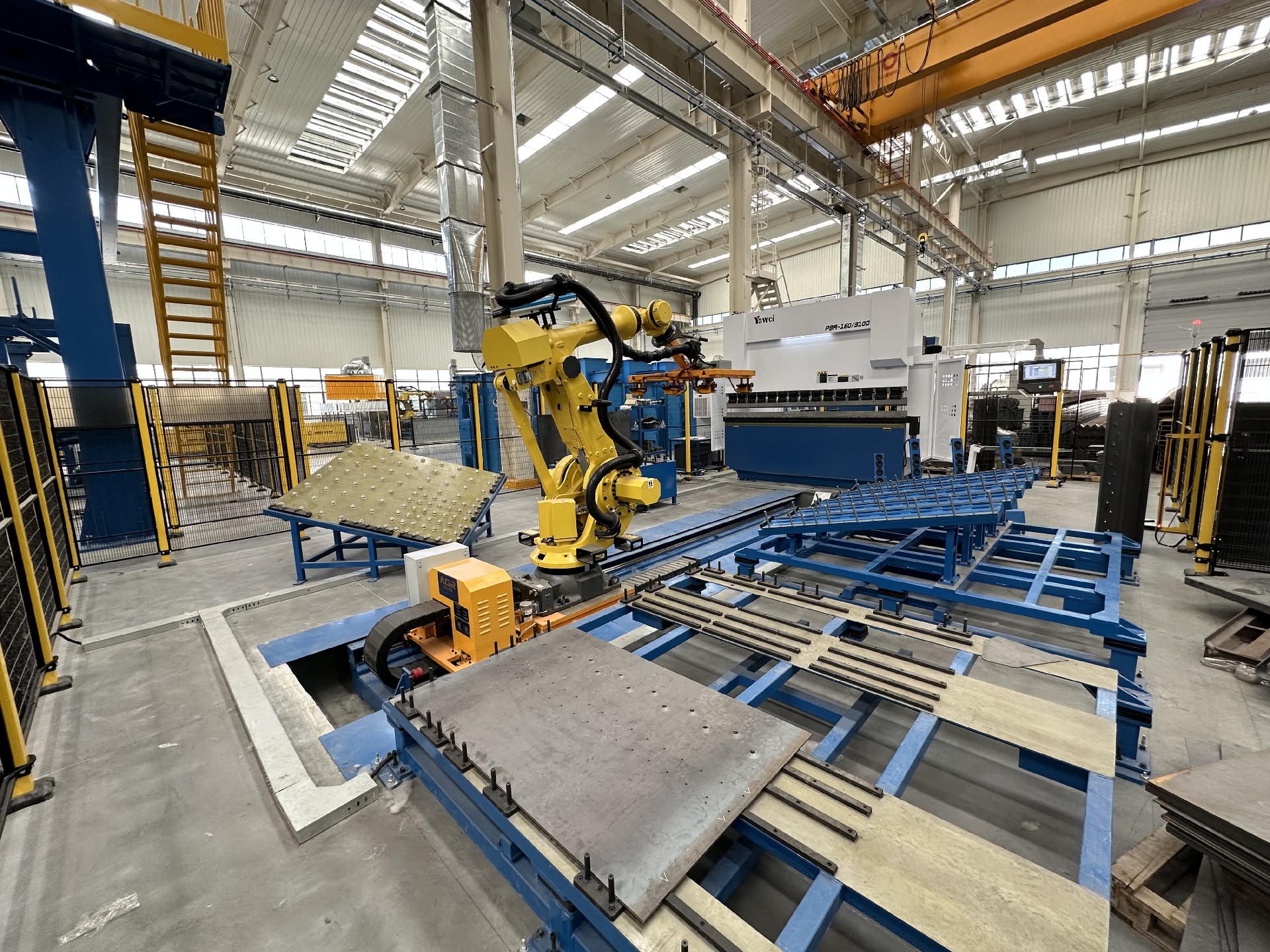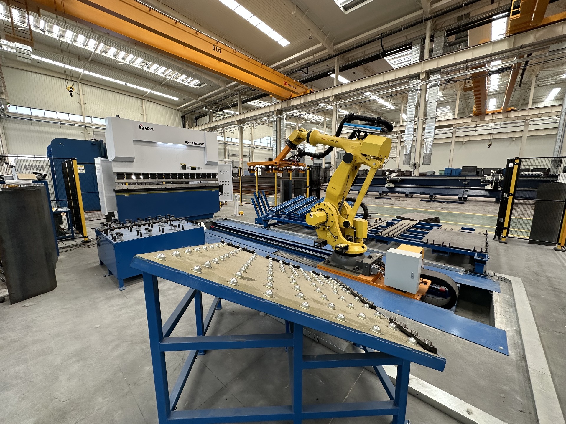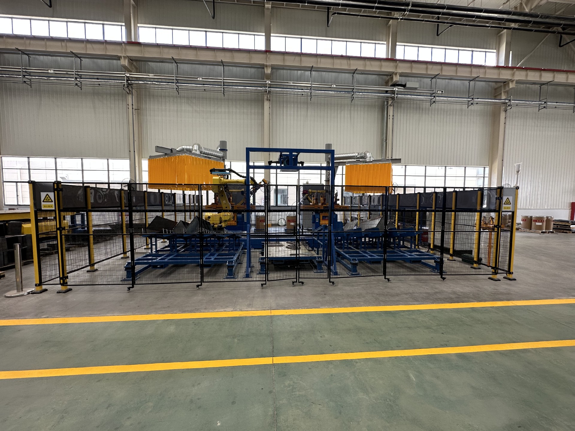 本工作站配備2臺(tái)焊接機(jī)器人、1 臺(tái)搬運(yùn)機(jī)器人、2套兩軸變位機(jī)、4 套組對(duì)工裝、1套搬運(yùn)機(jī)器人地軌、1套抓手、2 套旋轉(zhuǎn)立柱除塵系統(tǒng)、1 套視覺系統(tǒng)、1套電氣系統(tǒng)及對(duì)應(yīng)輔助設(shè)備,以自動(dòng)化代替人工,提高焊接效率和質(zhì)量。