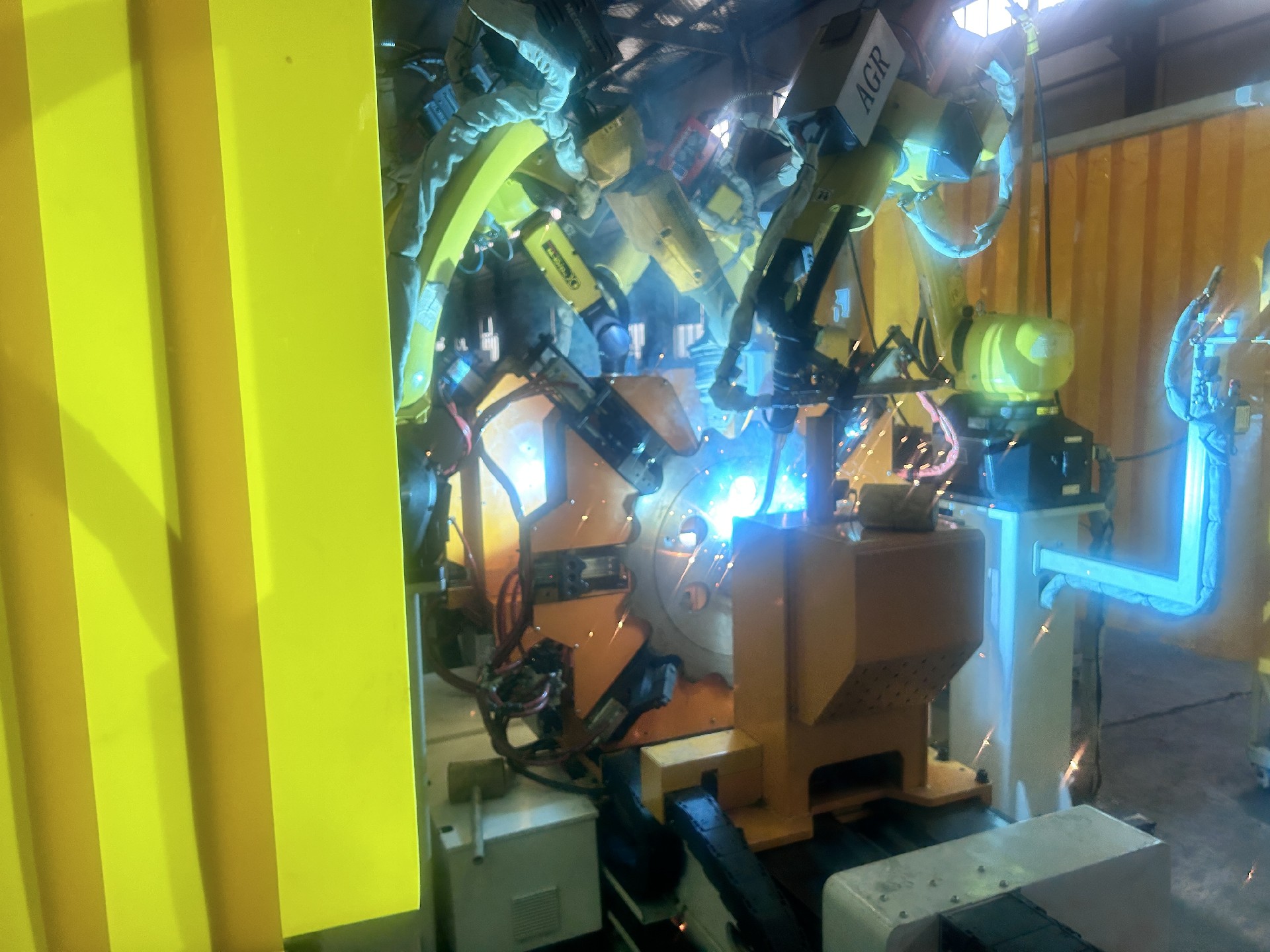 (3)焊接位配置四臺(tái)機(jī)器人,其中兩臺(tái)負(fù)責(zé)烤火預(yù)熱,全部四臺(tái)兼責(zé)點(diǎn)焊與焊接工作。
