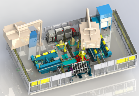 工作站包含雙工位,由兩臺焊接機(jī)器人分別對應(yīng)每個工位的焊接任務(wù)。焊接的是兩種產(chǎn)品,搬運(yùn)機(jī)器人負(fù)責(zé)自動拼點(diǎn)任務(wù)。