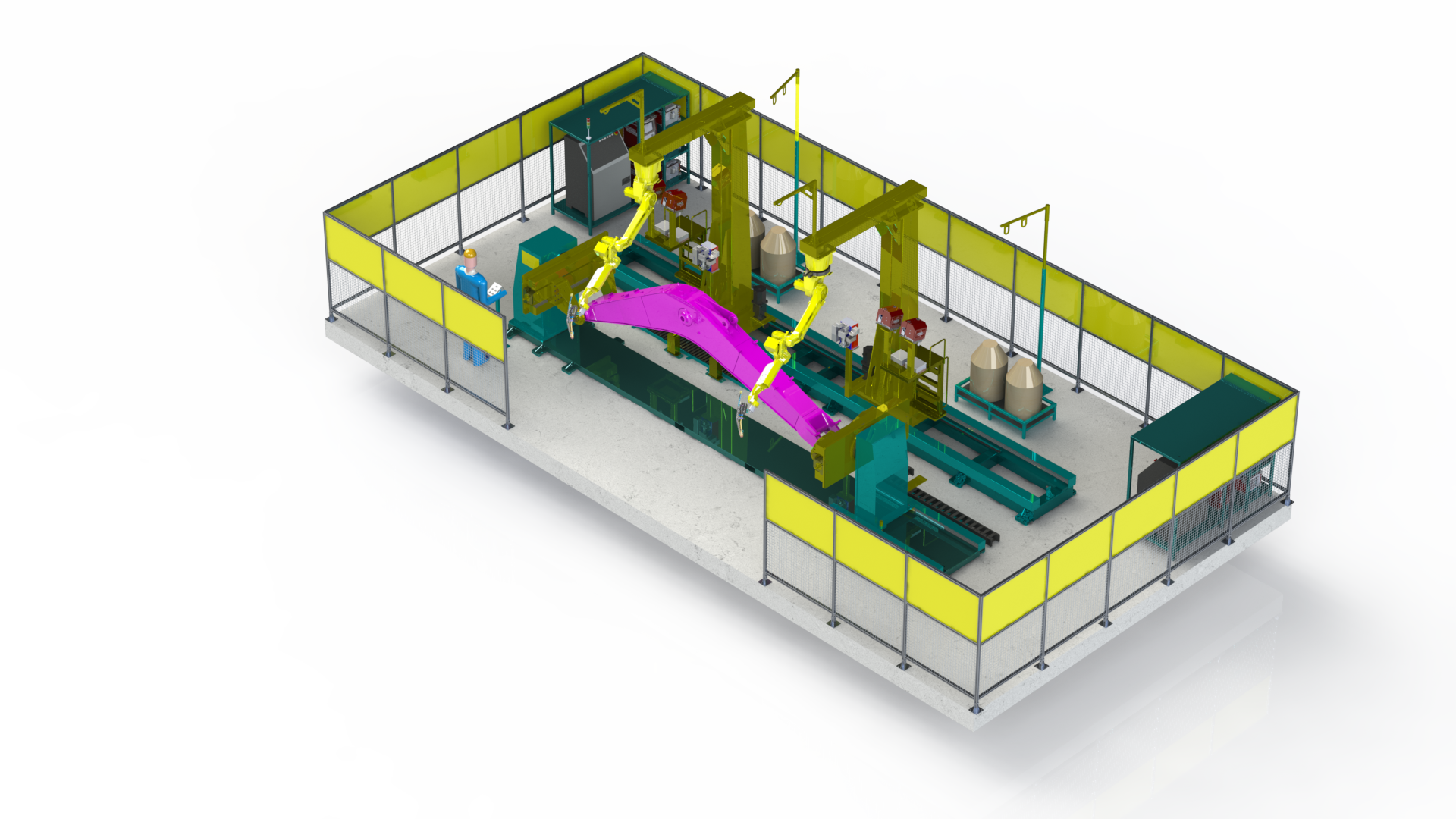 5機(jī)聯(lián)動(dòng)機(jī)器人焊接系統(tǒng);變位機(jī)承載能力達(dá)到1噸,適用于多型號(hào)動(dòng)臂斗桿結(jié)構(gòu)件的焊接;反變形及夾緊定位一體化設(shè)計(jì)伺服夾具,與工件自 動(dòng)化柔性輸送系統(tǒng)配合,可實(shí)現(xiàn)多種型號(hào)工件的自動(dòng)裝夾。